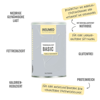INSUMED Trinkmahlzeiten werden auf der Basis von Milcheiweiß hergestellt. Durch den langsamen Anstieg des Blutzuckers nach dem Verzehr wird der Abbau von Körperfett erleichtert und die Gewichtsreduktion gefördert. Der pflanzliche Ballaststoff Nutriose begünstigt die Aufnahme von Mineralstoffen, optimiert die Verdauung und bewirkt eine langanhaltende Sättigung. Die Kombination der unterschiedlichen Proteine sorgt für einen muskelaufbauenden bzw. muskelerhaltenden Stoffwechsel.