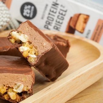 Zutaten: Süßungsmittel: Maltitsirup; Maltitschokolade (Süßungsmittel: Maltit; Kakaobutter, Vollmilchpulver, Kakaomasse, Emulgator: Sojalecithine; Aroma),Milcheiweiß, Fruktosesirup, Haselnusspaste, Sojacrispies (Sojaeiweißisolat, Reismehl, Gerstenmalzextrakt, Salz), Kollagenhydrolysat, eiweißangereichertes Molkenpulver, Puffreis, Dextrin, Fruktose, fettarmes Kakaopulver, Palmfett, Aroma, L-Ascorbinsäure, Salz, Emulgator: Sojalecithine; Nicotinamid, DL-alpha-Tocopherol, Calcium-D-Pantothenat, Pyridoxinhydrochlorid, Thiaminhydrochlorid.