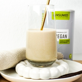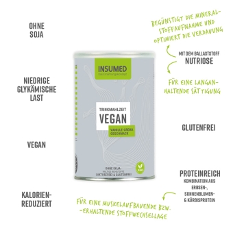 Die Trinkmahlzeit VEGAN ohne Soja wird auf Basis von Erbsen, Sonnenblumen-, Kürbisprotein hergestellt und ist laktose- und glutenfrei. Der neue Shake ist frei von Lupinen-Eiweiß und eine gute Alternative für Veganer. Durch den geringen Fettgehalt und die niedrige Insulinantwort nach dem Verzehr wird der Abbau von Körperfett erleichtert und die Gewichtsreduktion gefördert. Der pflanzliche Ballaststoff Nutriose begünstigt die Mineralstoffaufnahme und optimiert als Präbiotikum die Verdauung. Die Kombination der unterschiedlichen Proteine sorgt für eine muskelaufbauende bzw. muskelerhaltende Stoffwechsellage.