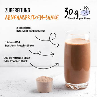 Für einen Shake: Zwei Messlöffel Trinkmahlzeit und einen Messlöffel Bestform Messlöffel Bestform in 300 ml fettarmer Milch im Shaker aufschlagen. 29,7g Eieweiß pro Shake + Ballaststoffe und Vitamine. Die Empfehlung sind 2 Shakes am Tag. Wenn Sie der Empfehlung folgen reicht dieses Paket für 30 Tage.