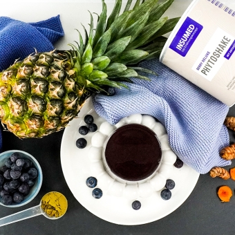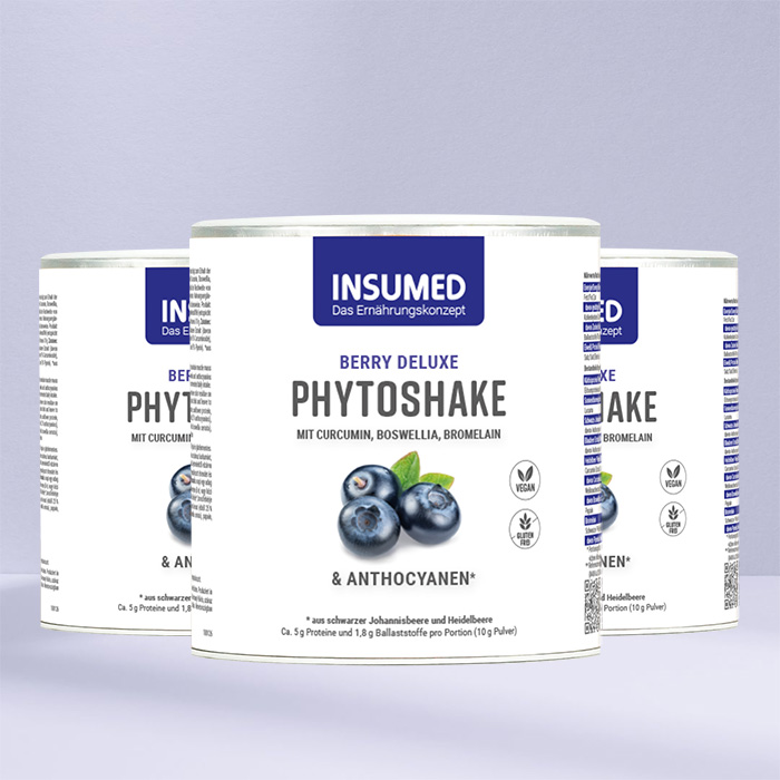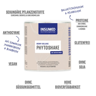 Der INSUMED PHYTOSHAKE berry deluxe beinhaltet die sekundären Pflanzenstoffe Curcumin, Boswellia, Bromelain, Anthocyanen aus Schwarzer Johannisbeere und Blaubeere, sowie schwarzen Pfeffer, zur Erhöhung der Bioverfügbarkeit. Er enthält außerdem eine ballaststoffreiche und pflanzliche Proteinkombination aus Kürbis-, Erbsen- und Sonnenblumenprotein.